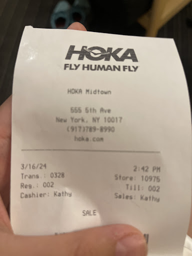 This attitude is so unacceptable. This is who she is because I noticed she acted the same way as another employee. While we were waiting for the attendant to bring our shoes out, we saw her arguing and yelling with another employee at the register using aggressive body language. She even took her off the register signaling for her to leave. We tried waiting for another cashier but no one ever came. This was such a headache for no reason. I wanted to exchange the shoes today since it was my day off. I work down the street but it is hard for me to bring the shoes to my job since it doesn’t fit in my locker. I commuted to Manhattan today specifically to visit the Hoka store, which is far from me since I live in Staten Island, it is a 2-and-a-half-hour commute. I couldn’t even purchase the shoes I found in-store today, which were the last pair in the size and color. When I got home I was disappointed since I came home empty-handed and the receipt at home. I now have to go on another one of my days off to return the shoes due to her unprofessionalism and insufficient skill since she could have searched up my purchase in the system with the date and time but chose not to. She is a horrible representation of Hoka.