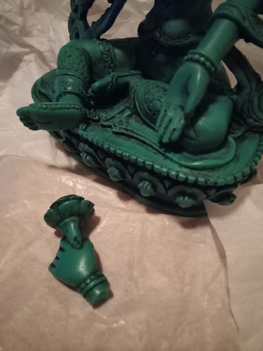 DISGRACEFUL!!! . I contacted the shop owner after my mother purchased a statue for $117. The statue was wrapped flimsily in tissue paper. My mother asked for bubble wrap or a box but there was nothing to give her and so she was careful, but all the same when she got home an unwrap the statue, she saw that an arm had fallen off. In addition she realized that the fourth arm was completely missing. My mother is not familiar with Tibetan or Nepali religious goods. She wasn't aware that there should be a fourth arm however the shopkeeper who sold it to her should have know it was missing. I contacted the owner who proceeded to blame my mother and to defend herself by saying that she's just a small shop. She won't replace the item. She won't even look for the missing arm. I am entirely disgusted and the joke here is the name of the shop. A business such as this which has the nerve to have karma in its name and then treat a customer this way -- it is...