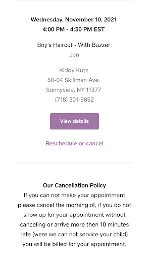 Warning!! Please be careful everyone My first time going there was really nice and I love the lady who cut my kids hair she is a wonderful ladyâ€ïž so I was happy to take my son again and made a appointment for today. Now I had I really bad experience with the lady who mange the phone calls!! đ Back story I had made appointment for my son for today from 1pm to 1:30 pm all my appointments were made through the app. Then yesterday I made 2 more appointments but first I check if they had anything available so they did. I made 2 more appointments for which was for 2pm to 3pm and the other one for 3pm to 4pm and my appointment was accepted. Now keep in mind I live in the Bronx so as I was getting ready this lady calls me saying that she has to accommodate me because each kid takes 1 hr and ask me if there hair was really tangle. I was surprised to hear that since I already book the appointments and was for de tangle hair and cut time 1hr. Since that call I started getting emails that she had change my appointments so many times and then I received another call her telling me that other workers were going to be doing my kids hair because â I am taking to much of their time by booking for 3 hrsâ you canât imagine the feeling I had when I heard that. I let it go and didnât say nothing. So as I keep checking my emails I see they change more even one to 4pm and for a different treatment so k called and me trying to be nice since seems to me sheâs having a problem with me booking 3 appointments I told her I would like to cancel and decided to blame me for it by telling her that I see different workers and that I wanted the same nice lady who took care of my son with autism last time to do my little girls hair and as soon as I told her she tried to force me to go to the appointments and told me that she is trying to help me and accommodate me and she was already screaming at me and giving me actitudes then she told me that she will also charge me for canceling when I never had no problem at going but did had a problem with her telling me that am taking a lot of time from them by creating 3 appointments so I got so upset and ask her why she is trying to force me to go when sheâs having trouble and changing my appointments around. So now k got 3 invoices of her charging me $20 when she made the entire mess. I also will love to speak to the owner of this place because this is not okey. I have the emails I have proof of all the mess she did and how she force and threaten me to charge me when k actually call to cancel. Almost 2 hrs before and just because of her actions and actitud. I will leave here photos of my actual appointment and all the changes she did. Keep in mind cancelation fee says if you do not cancel in the morning or if u donât arrive or come 10 minutes late a cancellation fee will be charged. I cancel by phone before 12 pm and then around one I started canceling in the app and the reason was because of her blaming me for making 3 appointments. She also put that I was being rude when I actually have proof of all the mess she did just because of my appointments being 3 children. Why accept my appointments if she had problems with me taking 3 appointments. I will try to reach out the owner and make a video about it because this is not okey. I will be also explain this same thing in Spanish so people can be aware that this lady has problems for making more than one...
