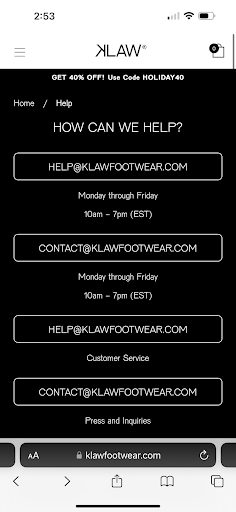 I have tried calling the phone they have listed and it goes to a French man’s voicemail. It doesn’t go to Klaw Footwear. I called it a few more times and a man answers and then hangs up. I’ve reached out to their Facebook and left a message there. All I’m asking for is my refund for both shoes as it clearly shows Klaw Footwear has the returned shoes.