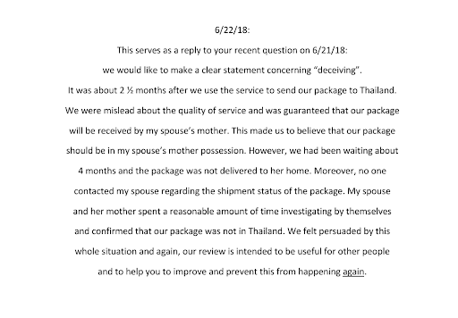 first, let me start off by correcting a mistake with the reimbursement amount that I received for the package that your business lost, I have a receipt showing it was 175 usd and NOT 150 usd. 75 for the shipping fee and 100 for my contents. itâs contradictory to the claim that the owner did not know of the story and the person who reimbursed us for our loss. next, apparently, my rights to post honest and truthful negative experience that I have encountered with the business has gotten some attention many months later. please understand that I am not a hired content writer and the review is not intended to defame the business in any shape or form nor it is intended to ruin personal reputation. It is to inform both the customer on decision making and, if taken properly by the owner of the business, help them improve their business practices. the professionalism, the lacking of investigation on my lost package and the resolution on the matter has resulted in us utilizing other businesses to ship out our contents safely and worry free. in addition, I wish to know who advise you to show up unexpectedly at my residence and belligerently demanding to know where I am (how did you get my address?). lastly, we do not know how you entered into the common area of the residence and what you were looking for by searching through the tenantsâ mail and knocking on and opening doors. We now feel threatened by your actions and want to warn you that if you decide to show up again, I will report you to the appropriate local authority and file a formal complaint.