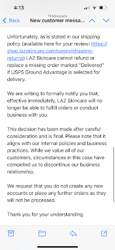 Ā Ā Ā Read moreProbably the most unprofessional company I have ever worked with. I spent around $160 on products ordering from their website 2 times in a row. The second time I ordered, usps misplaced my package and someone stole it causing items to be missing. I understand their policy of if itās marked delivered basically too bad so sad. Company was not willing to assist at all. I even asked if they would simply provide free shipping so I can repurchase the items with no shipping cost. They ignored my email several times and finally after I emailed them again asking for help and letting them know how terrible their customer service is, they say they can no longer do business with me. I am a willing and able customer to spend a lot of money on products I am purchasing and was just very disappointed my package got lost and they were not willing to do anything to assist. Kate, you have terrible...
