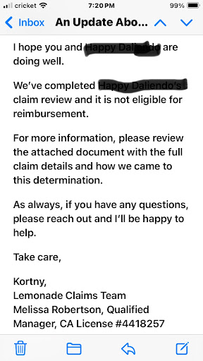 But reading over the reviews here on Google, I would NEVER purchase from Lemonade any of the following insurance; -Pet (automatic pre-existing condition denials, just no)