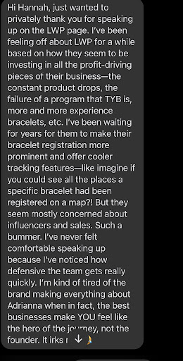 I have been a long time supporter and loyal customer of the brand, have been an ambassador, and easily spent thousands of dollars on bracelets. The brand has been in what the founder calls āan era of changeā for a bit now, but the change is not for the better. I used to be very active in the Nice Nation group for customers, sharing how LWP has allowed me to share kindness, express my story and mental health journey vulnerably, and even just sharing my daily stacks. However, the last several months have brought about significant change for the brand, ones that have been hidden to the public such as the one in which youāre in the store asking for your bracelet to be resized under the lifetime warranty (used to be no charge) and now there is a charge. There have been collaborations with influencers and groups that have created bracelets with problematic words that can be seen as offensive to those struggling with mental illness and infertility. As a loyal customer, I have been adamant about asking for clarity, consistency, and transparency in the group, only for my posts to get deleted or have passive aggressive responses from the founder & CEO, Adrianna Carrig, addressing those expressing issues or confusion in a demeaning way and reprimanding us like middle school girls. I even had a personal experience at the Boston store over the phone that drove me to tears, to which I reached out to Adrianna and was guilted into apologizing for expressing my experience, how upsetting it was, and was ultimately publicly ridiculed in the group by other customers (not so āniceā nation, is it?). After asking a question in the group, and not receiving a clear answer and asking for clarity, Adrianna once again jumped into the group asking us to be nicer to the moderator, and when myself and another member responded that we were only looking for clarification and no hate or rudeness was expressed, but that we would no longer be customers, we were blocked by the Nice Nation group and I was personally blocked by Adrianna on Facebook. Prior to this, I also commented on a post regarding the āone size fits allā initiative they are taking in larger retails, including Target & Disney Parks, saying how it seems wrong to offer that someone buy that one size fits all bracelet, but make them pay the resizing fee. In an effort to share my experience, I took to TikTok, making a video that allowed others to share their experiences with the brand (and they did in the comments!), as many had reached out to me over the months to ask if I had noticed that things that had been inconsistent or different with the brand. I shared their concerns as well as mine. Upon posting this, I was bullied and harassed by current supporters of the brand and group, which felt so ironic, as Adrianna built the brand after her own experience being bullied, but as of recent, sheās been the one to show up as the āmean girlā, taking on the role of PR and customer service for the brand, rather than utilizing the staff she pays for these roles. She has privately expressed to me that āshe is the brandā, so all comments she takes personally ā from a business perspective, this is no way to run a business if you cannot separate your personal feelings from the criticisms of your business, when you have even admitted that there have been missteps and things gone wrong over the last several months. Their word of the year is āgraceā and I have been told by her, as well as others who felt the need to enter the conversation to invalidate my experience as well as that of others, that I need to give more grace as they are ātrying their bestā. I am no stranger to someone trying their best, but the lack of clarity, consistency, transparency, inclusivity, and kindness (from the founder and other group members) make it difficult to give grace when it is a repeated issue, not an isolated incident. Below, you will see some screenshots of othersā concerns with the brand. I will no longer be supporting a brand that was ābuilt on kindnessā but perpetuates bullying customers who just want...