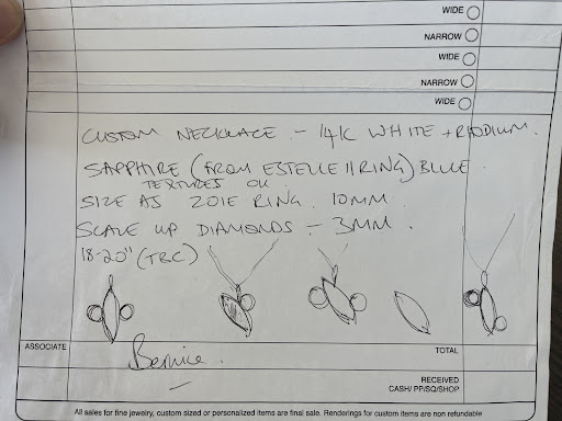 2022 (edit* Dec 2021) After a short discussion about working with Bernice for engagement ring/necklace. I was unsure and my wife was out of the country. A brief pen sketch ideas were placed on an invoice paper. Bernice asked me a $500 deposit.