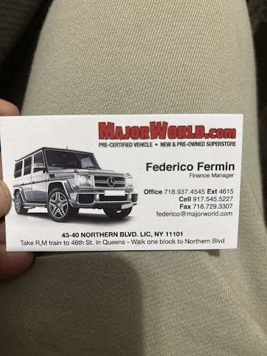 Read moreSaturday, April 5th, I brought my fiancée to Major World, where I purchased my current car. Since I had an awesome experience, I hoped & figured it would be a similar one for him. We got there, and we're met by Omar Hernandez, a (client advisor) he took us into meet Franco (last name unknown) to go over what we wanted to spend & crunch numbers. Once that was established, we were brought outside by Omar & found 3 vehicles. We then were brought back inside to see if the monthly payments were what we were comfortable spending. They were on the higher side, so we again went back out to look for cars under 20,000.00 (by the way, there aren't any that can be financed) we were told CASH SALES ONLY for the half of a handful we saw. Omar, & all the staff at Major World are very knowledgeable, helpful, cunning and at the end of the day, they are doing their job... On our 2nd time going outside to look at vehicles we found another 2 cars, and I asked for my fiancée to test drive them & also for the carfax report on these vehicles and again NOTHING WAS DONE TO ACCOMMODATE US... even after they took our deposit, which they were rushing to do, we still weren't able to test drive the car he settled on. The payments were still on the high side, but he was offered by Franco a bi-weekly payment agreement, which we felt would be best our best option. We assumed we would receive due dates and such before we left there. AAANNNNDDDDD Still never received a copy of the carfax report on the car he gave the deposit for... I am sorry to say that Major World disappointed and dissatisfied me as a customer... After the car was ours, though, we were shown the carfax report on said vehicle and come to find out it was in a major frontal and rear accident. Being honest, we wouldn't have agreed to buy the car, knowing that it was in a major accident. We were duped. To make matters worse after we left and realized we didnt get the payment due date nor the insurance dates my fiancée called to find out when his first payment was due and he was told since we never signed up for bi-weekly payments the payment would be on May 5th... um, we only agreed on that vehicle due to the bi-weekly payment option. Again, how that works and signing that paperwork was left out by Franco. Food for thought, all that glitters isn't gold, and just because people come off as knowledgeable and nice don't mistake it for they are going above or beyond, there's a fine line but a big difference. Major World, pay me my 200.00 for sending you a customer because I won't be sending anyone else or coming for my next vehicle.