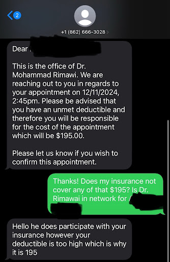 Prior to my appointment with Dr. Rimawi, I asked (on the phone and confirmed via text, attached below) if he was in-network with my insurance and was told he was, but due to the deductible I had to pay out of pocket before the visit.