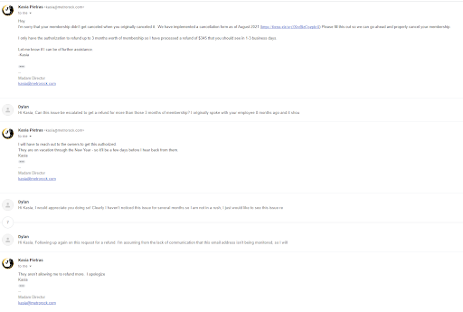 This review is pertaining to the management refusing to refund almost $500 that was mistakenly charged as a result of their employee's mistake. I discovered this issue after several months of charges and while initial communication was good, I was ghosted for a month by the manager Kasia Pietras who was supposedly inquiring with the owner (I assume CEO Pat Enright?). After a month of follow ups via email, calling the business and following up via text, I receive one last communication denying my request. I intend to file with small claims to sue for the money owed but I want to warn others so they can avoid going through this stress--do not open a membership here and if you do, make sure you fill out their new cancellation form (implemented after this issue occurred) and confirm your account is in the correct status and you aren't getting charged. The original mistake was that the employee used an incorrect billing status when I asked to pause my account after injuring my ankle in the gym. This review also pertains to MetroRock Williamsburg which is managed by the...