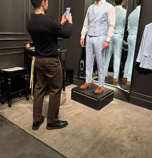 THE SUIT - Their options of fabrics, buttons, linings, and more was impressive and even overwhelming had we not been guided and helped by Shane. He would ask what we were looking for and a handful of books with fabric would be pulled as we explained the aesthetic we were aiming towards. We were measured and orders were made in a timely manner, and delivered and scheduled for follow up measures to then polish and further refine what was already made to measure. We looked great, the suits fit us *almost perfectly and Shane was putting in more time and effort to make them even better!