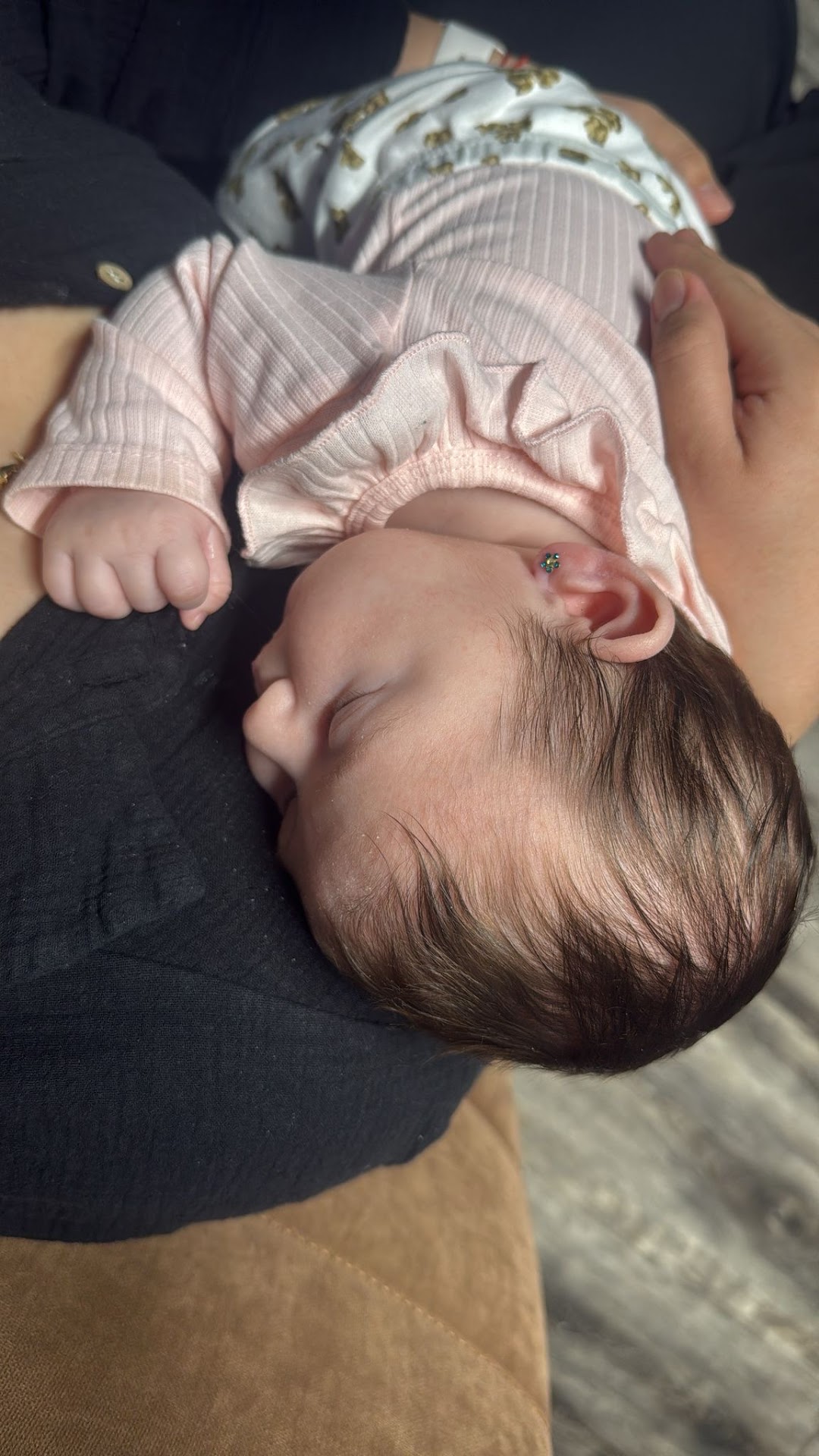 El momento de la perforación fue rápido y delicado, y lo más increíble fue que mi bebé casi no lloró. Mónica se tomó el tiempo de asegurarse de que los aretes quedaran simétricos y bien colocados, y el resultado fue simplemente hermoso.