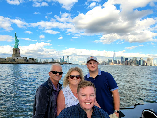 Eric, our captain/guide, was so knowledgeable, funny, friendly, and even took great photos of our group at many of the landmarks. If you're asking, the risk of getting wet is low, the boat is designed to push water away. We never got wet which was a plus since we had a Broadway show later. đ The speed was awesome, safe, and comfortable while zipping around the harbor, Hudson, and East rivers.