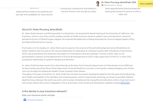 I started as a patient with Dr Jahan Shahi in December 2023. I was convinced by statements on his practice website that indicated he was currently a faculty member at NYU at Mt. Sinai. His Zocdoc profile left me with the impression that he was board-certified. After a visit in which he gas-lighted me by saying that my attachments were put on properly, when in reality they were all uniformly .5mm too low on my teeth, I did my research and found out that most of the information was outdated and false. During a recorded phone call, Dr. Jahan Shahi told me he was board certified. I went to the ABO and verified that he was not. After a second recorded phone call he confirmed that he was in fact not board certified, but he had been in 2007 (it expired in 2017). He also claimed he was currently a diamond plus provider with invisalign, but after calling invisalign they told me he was listed as gold plus. To add a cherry on top: he also claimed to pursue serving underrepresented youth at the Adolescent Health Center in Harlem. I called them, not only had they never heard of him, but they never even had dentistry!!