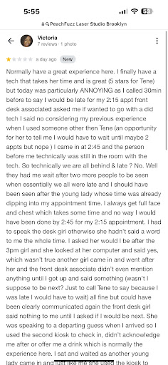 Read moreNormally have a great experience here. I finally have a tech that takes her time and is great (5 stars for Tene) but today was particularly ANNOYING as I called 30min before to say I would be late for my 2:15 appt front desk associated asked me if wanted to go with a did tech I said no considering my previous experience when I used someone other then Tene (an opportunity for her to tell me I would have to wait until maybe 2 appts but nope ) I came in at 2:45 and the person before me technically was still in the room with the tech. So technically we are all behind & late ? No. Well they had me wait after two more people to be seen when essentially we all were late and I should have been seen after the young lady whose time was already dipping into my appointment time. I always get full face and chest which takes some time and no way I would have been done by 2:45 for my 2:15 appointment. I had to speak the desk girl otherwise she hadn’t said a word to me the whole time. I asked her would I be after the 3pm girl and she looked at her computer and said yes, which wasn’t true another girl came in and went after her and the front desk associate didn’t even mention anything until I got up and said something (wasn’t I suppose to be next? Just to call Tene to say because I was late I would have to wait) all fine but could have been clearly communicated again the front desk girl said nothing to me until I asked if I would be next. She was speaking to a departing guess when I arrived so I used the second kiosk to check in, didn’t acknowledge me after or offer me a drink which is normally the experience here. I sat and waited as another young lady came in and just like me she used the kiosk to check in because the front desk girl was with a client and after she acknowledged her and offered her a drink etc. why hadn’t I gotten the same treatment? Smh overall i recommend the facility and the services especially with Tene but todays customer service was not it and I travel from NJ to come here. The front desk girl here today made this appointment the worst from her lack of customer service and clear communication.