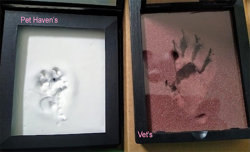 [Edit I appreciate Pet Haven taking the time to respond to me. As noted, I would have let the paw print thing go if it wasn't for the ash issue. I understand the shape difference reasoning, but it still looks rather sloppy to me with the indent below the print and the dragging trail down of it. (I know it will not be perfect, but I haven't received such flaws with my previous 2 cats I had this done with from where I used to live.)