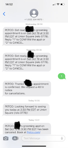 I drop my daughter off and call them while she's in class at 11:57am. Petco tells me again that Ella was only scheduled to work until 5pm today and I need to bring the dog now. I say that I can't, that's the reason behind an appointment. I have other things to do. I'm not home. I also live 45 minutes away. Their response? Well, you can still bring the dog at 3:30 but then Ella will have to groom her straight through. I say, what does straight through mean? They tell me that means without cage time and without a break which is bad for dogs and also it'll be a VIP treatment. It's not until I ask, is that an extra charge for me that this person confirms that yes, it would be. Again, WHAT??