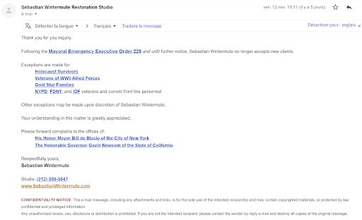 Last week, I emailed Sebastian to see if we might set up a time to discuss restoring an old photograph of my grandparents. I immediately knew that something was off when he replied to me stating that he is not taking any new clients because of the NYC mayor's vaccination requirement for indoor activities. In the body of the same email, he suggested that I forward any "complains" (sic) to the mayor of New York or the governor of California. Yes, that California, a state several thousand miles away from where Sebastian operates....... I'm not kidding. This actually happened and I've included a screenshot of Sebastian's email with this review.