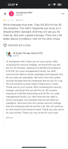 The staff is very nice and the place, while very very barebones is nice and clean. However, I wouldnât recommend or go again. I like a firm massage however I was left externally sore, in writing this with a hot water bottle on my shoulders over 12 hours after the massage. My masseuse was very kind but seemed take when I said something hurt or âreally hurtsâ as âthis is the spot I want focused on and do it harderâ I get he probably thought it was getting a knot out however they were just area I have issues with that hurt when pressure is put on them. I wish there was a bit more communication or moment at the start when I could have said where I have issues/need to go gentil on. I have a long term should problem and there was a significant pulling and stretching on my shoulders which would have been nice to have avoided especially because at one point, kneeling on top of the massage bed, he pulled both my arm far back behind me lifting me up and fully exposing my chest, he was behind me and likely unable to see anything but it ultimately made me feel very...