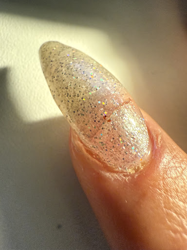 I ENDED UP HAVING TO GO TO TARGET AND PAINT MY OWN NAILS MYSELF THE DAY BEFORE MY WEDDING. I has to add sparkles to save the image of the shape, the idea there was no polish on, and it was completely uneven. HERE I AM ONLY 4 DAYS AFTER GETTING THEM DONE AND ONE HAS BROKEN DOWN TO THE MIDDLE OF MY REAL NAIL AND CRACKED IN HALF (this is the finger she pushed up on and hurt me btw) AFTER I PAID FOR THE ULTIMATE GEL THAT SHOULD BE ABLE TO HANDLE KEYBOARD WORK.