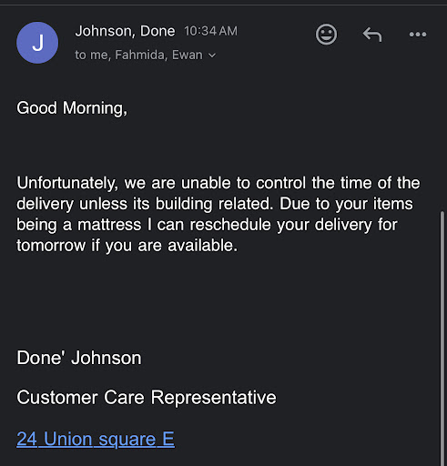 At the time of the visit/purchase - we were satisfied but when the delivery team came, it was very clear that we were misadvised. We were told the delivery team couldnât take our old mattress due to wear and tear. We 100 percent disclosed it was a very old mattress (joking that my husband has been putting off a new one) At no point did Ely Paulino tell us that it might be an issue. We were told that weâd have to move the mattress to basement. I had recent neck surgery (by the way our sales person told us she had a tummy tuck - (unprofessional) and my husband has cardiac issues. We clearly couldnât move it and would have made other arrangements if we were informed. I called the Union Sq store immediately and spoke to the manager, Joshua Acosta (possibly Jonathan Rigand b/c two names on card). He was dismissive and not willing to help in an acceptable manner. When I mentioned that we payed for the service, he smugly said that we didnât and âincludedâ in price. Question - how is it different than paying for it.