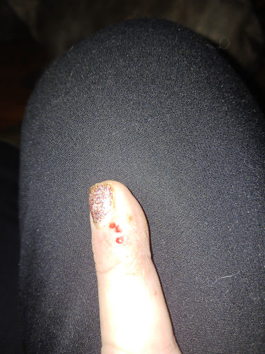 It was healed over and scabbed. The nail lady used her drill to grind the scab down. I immediately told her to stop but the damage was done. I have had a huge infection in my finger for over a month. I have been to the doctor 2 times. And even with treatment it's bad.