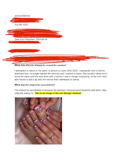 But wait: THERE’S MORE! I thought the application process was hell but my nails, to this day, are still recovering from what she did to me. On my thumb there was so much monomer, and product, on my flesh that I had to cut a chunk of my flesh out in order to get it off. Within a week of getting this “service” nails were popping off, I had to go to the doctors twice to be seen for possible infections, and the cuticle on the thumb of my left hand is permanently damaged. Truth be told: I should’ve sued for all the hell this put me through. I’m so glad I was able to get my money back from this salon and I will NEVER GO...