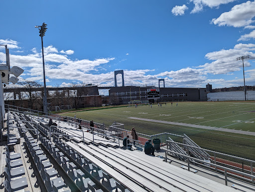 Very good turf Marked up for football which is not that great for soccer Unfortunately only cheap sagging fold-up goals for youth soccer Clean bathrooms in nearby athletic center Throngs Neck bridge nearby, other bridge and incoming planes to La Guardia in background Windy because of exposed location surrounded by water Large stands Good floodlights Bottom line: college quality sports field with good turf in a...