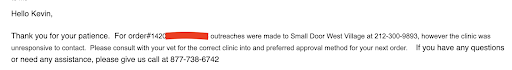 When my other dog (Comet) was sick they did blood work and held the results for 48 hours AFTER they received it despite me telling them several times that it was an emergency and I had to take him into an emergency clinic (and would have to repeat this costly blood work all over again). How did I know it was withheld? Because when they finally sent it the date that it was received by Small Door from the lab was stamped…The doctor finally looked at the results and said everything looked fine. But then two days later called me to tell me that one of his levels was doubly elevated. Despite that she still would not help to troubleshoot what the issue was - still chalking it up to “stress.” At this point my dog had been sick for two weeks. There was zero empathy shown from the vet, not a single follow up call, nothing. After I begged to talk to the vet she finally called for 5 mins. At which point we switched to a new vet…Our new vet quickly identified that this was caused by an allergy, switched Comet over to hypoallergenic food and his symptoms started clearing up. She deduced this from the blood work and his symptoms.