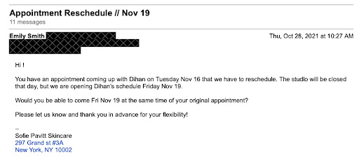 Emily Smith reached out to me via email on 10/28 and said that the studio would be closed on 11/16. As an alternative, Emily offered me an appointment on Friday, 11/19, which I accepted via email 48 hours later. I never got an email confirming my appointment the week of, as I did the first time, so I reached out to Emily to confirm. Emily told me they didn't have it "logged" in their system and offered me another appointment that didn't work with my schedule.
