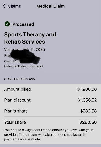 I went in for a consultation for my foot injury and was told the payment was $40. A week later I checked my insurance and saw an out-of-pocket charge from them for $260. I was like whoa and asked them why they billed $1,900 for only one visit, the fun started there. The front desk said the therapist did that and the therapist pointed back to the front desk. After a while, they finally gave me a number to call billing, and the billing told me it should have been $40 and I needed to call my insurance. I was like why would an in-network session cost $1,900 to begin with, he didn't have a good answer.