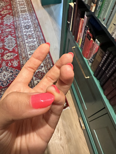 At any other studio this would have resulted in an automatic refund, and while Caity was apologetic, she kept referencing communicating with “Support” and only offered me a 10% discount. All my fingers were in pain after Rinku’s rough handling and filing; I figured it would fade. It wasn’t until I got home that I realized she had actually cut the skin on my pinky under the nail (photo here—Caity took the photos of the uneven manicure that was fixed so unfortunately I don’t have those).