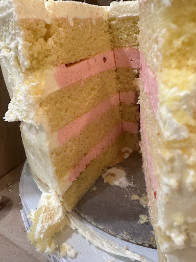 The cake was ready for pick up Saturday afternoon, from the outside it was exactly what I had ordered but little did I know, the inside of the cake was NOT what I ordered and found out when it was too late. We celebrated my sonâs birthday Sunday, after singing âHappy Birthdayâ we cut into the cake and come to find out there was VERY PINK AND VERY BRIGHT icing inside. Absolutely no fresh strawberries at all, and the filling looked and tasted very artificial. My husband and I were very disappointed because I spent almost $300 for my Son's 1st birthday cake that looked like a fruitless pink gender reveal.