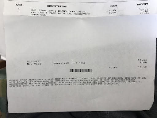 I almost hand him my card when he says $20.XX. How does one get $20 from $15.49, and when I asked he said there is a $2 charge to email my scans... I told him I’ll come in and receive a CD, and Inconvenience but I’d rather waste my time than give this place an extra penny. Now the total goes down to $18.12, and I was fed up and just trying to get out of there, and gave him my card. Upon reviewing my receipt (view photo) $1.65 to cut my film and put it in plastic, like I have a choice to be walking down Lafayette with a roll of film flapping through the air and in peoples faces -.-