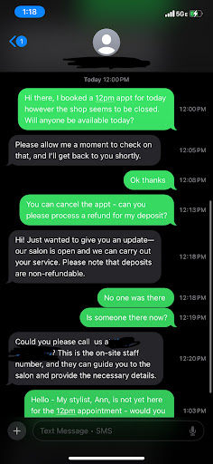 In between waiting on a response as to whether or not the shop was open - I sought alternative solutions since I was planning on getting my hair styled today. I found a Dominican shop around the corner, I called they said I would have to wait and that was fine since I was walking in, I was just happy they could take me. As I walk over to the Dominican Salon, I texted the Hairport marketing number to request to cancel the appointment and get a refund for the deposit I paid. As you will see in the text exchange they refused and stated the deposit is non-refundable.