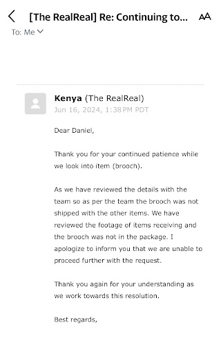 I have been an avid shopper and consignor of the real real since 2014 but will look to other company’s when selling and buying luxury items, I recently sent in 4 items which were all fine jewelry worth thousands. Once the package was delivered it took a few days for them to process the items which typically does a few days after I noticed that the items were all wrong and marked as not accepted and were random brands that I’ve never sent I immediately contacted their customer service and they fixed the issue once the issue was fixed I noticed they only marked receiving 3 items instead of the 4 items I contacted their customer service again and waited for them to investigate after waiting nearly two weeks I receive and email stating that what I was describing was never in my package I 100% know what I sent and would never try and lie about such an expensive item going missing. I will continue to reach out to customer service over the issue if no internal agreement is made I will be proceeding with legal actions as it states on your direct website ii) If an item of Consigned Property is damaged, stolen, or lost while in Our possession or during Approved Transit, it will be treated as Sold (as defined in “Title to Property” at Section 2(e) below) and We will pay You a Commission (defined in “Commissions and Payment for Consigned Property” at Section 2(f) below) on that item. The Commission will be based on the damaged, stolen, or lost item’s estimated Net Selling Price (defined in Section 2(f) below), which will be determined solely by Us. This payment represents the amount You would have received in the normal course of a sale, less any discounts or promotions applied under this Agreement, and the payment will be processed and paid under the regular schedule of Commission payments as described in...