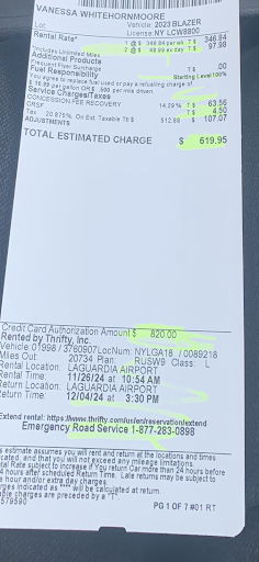This has been the worse experience in my life of renting a car. This was my first and last time of renting with Thrifty. When I first arrived on 11/26/24 to the LaGuardia site of Thrifty/Dollar two females were there. One named Renee and Another female I believe was Latino. It was pretty busy at the time and then came my time. The black Wonsan Renee asked me to hold at the very beginning to take a personal call for herself. After she thanked the person on the phone for her paying $11.00, she promptly hung up and looked at my face and asked sis I have a problem. I told her I was hot and she then started to look at my card over and over suspiciously until I pulled out the paper reservation to ask if she needed the confirmation. She asked the woman working with her at the opposite counter was this right and she answered yes. She then said I could go elsewhere or try to put the credit card thru myself. I was in utter disbelief.She told me no then out of nowhere she asked did I have another credit card. I said not with me why? She said bc my first initial was on there, but my name is hyphenated and different and she said even if it shows we the last name to a t and my First initial that wasnât good enough. She then said sheâd call her manager who she put speaker and he said he was interviewing and I would have to wait. I was appalled! This behavior is unacceptable for customer service. My husband and I waited and waited u til I had to call Priceline who the reservation were made thru to complain and they got involved to see what was going on. Finally, the manager called back and asked how many days was I going to rent for and she told him 9 along with me on the phone. She asked me 4/5 times the same question was my husband a driver and I said no youâve asked me this 5 times in which she responded youâre counting huh. I said yes, Iâm documenting everything so I can contact corporate as well as the ceo to let him know exactly what has transpired. Finally we received the car which was dirty on the driver side and dented up in the back and scratched. The guy at the gate asked my husband to sign and I explained to him that the vehicle was in my name and I needed to sign in which I signed above my husband âs signature. He was patient and nice. I took pictures then had the detail sheet filled out to show the dent in the very back and dings. Renee was very nasty, sarcastic and argument Iâve if that was her real name bc she didnât have a badge on, but luckily I took pictures of everything I was given from her and the man at the gate that filled out the problematic areas of the vehicle. Renee stayed for me to just make sure it was full during return. Now on the return of 12/4/24 the gentleman told us to pull in and my Priceline was supposed to be $620.73 per Priceline plus $200 deposit per Renee that she said Priceline charged and to ask them when I inquired about it. She said it would fall off as soon as I paid. Fuel was full and the gentleman with the glasses said I was all set and didnât need to go back in after he read me my name after dropping off early at 12:07 ish. I received nothing at all. He called for us a shuttle which a nice Jamaican man named John was very nice, but I was alerted by my back when I got off the plane that the declined an amount for the Full $820! What is going on? I would very much like a call from thrifty asap. At this point Iâm getting ready to report fraud. Thank GOD I have a family member who is an attorney and I knew to take photos of the total estimated charge of $619.95. I will be calling my bank and I need to talk to a manger from Thrifty before I definitely ask for a full...