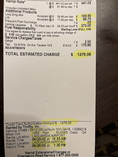 Read moreDo not rent from here. I was charged around $240 for an electric vehicle that did not work. After charging the car to 96%, which was supposed to give us 255 miles, the car broke down after 90 miles. The car was completely dead. We called Thrifty emergency roadside assistance and the representative on the phone said they would charge me to send a tow truck. I told her that my friend and I were stuck on the side of the road, it was dark outside and we were scared. I asked her how long it would take to get a tow and how much would they charge us? She said she didn't know and when I repeated that we were scared she said, "You can call 911," and then put us on indefinite hold. We eventually hung up. The car would lose charge so easily we had to turn our 6 hour drive into an 11 hour drive to accommodate for recharging the car. When I returned the car, I asked to speak to a manager at this Thrifty location. I was met with a customer service agent who was on a personal phone call, I asked her if she was on the phone and she said, "Yes, but I can listen don't worry." I asked her to please hang up the phone and I explained that on top of my car rental cost I had to pay $217 for a tow and I wanted Thrifty to cover it. She told me that I didn't charge the car. I explained to her multiple times that I did charge the car. And she later admitted she did not know how to charge the car. Then she spoke to a manager who was in the back office, she came back and said "We can give you $50 off your bill." I said the bill was over $200. Then the manager came out and tried to explain to me how cars work. No joke. He started explaining how with gas cars, "you fill the car with gas." I literally stopped him and asked, "Are you trying to explain to me how cars work?" He told me to call a help line to get my refund. (Note: I've called that help line multiple times and have yet to speak to a person. I keep getting directed to a website where I filled out two complaint forms but have yet to hear back from anyone.) When I asked where the $50 they were offering me came from, the manager admitted it was not actually $50 off the bill, rather it was a coupon for $50 off my next Thrifty rental. NOT GOING TO HAPPEN. It's been more than a week and Thrifty still has not returned my emails. DO NOT RENT FROM HERE. I even warned a customer who had been waiting there for over 30 minutes to not rent a car (especially an...
