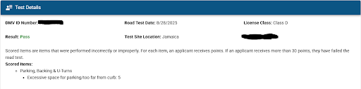 So: My road test was scheduled at 3pm with a pick up at 1pm in Manhattan/12th street.