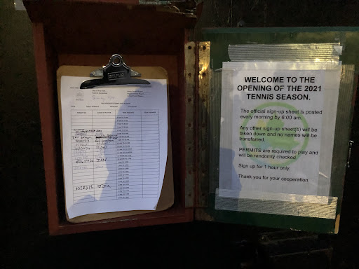 Reserving courts is painful. Someday maybe we’ll get the internet but it’s a ~6am paper list. NOTE: I arrived at 5:50am flat on Saturday in April and every slot from 8am-1pm was filled, plus a few after. I heard there may be some kind of “committee” that gets to put names in night before, but that sounds lame and I hope it’s not true. So it’s just to say: get there earlier than you want if you want a time you want. By 9am there were no spots.