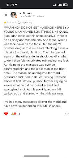 Read moreWARNING DO NOT GET MASSAGE HERE BY A YOUNG MAN NAMED SOMETHING LIKE KANG. (I couldn’t make out his name clearly.) I went in on a Friday and was the only one there. When I was face down on the table I felt the man’s privates drag across my hand. Thinking it was a mistake / in denial, I let it go. The it happened again on the other side. In shock deciding what to do, I then felt his privates rub against my feet. At this point the massage was over so I confronted him and the older man at the front desk. The masseuse apologized for “hard pressure” and tried to deflect saying it was his elbow at first. When I pushed further saying he knows what he did he looked scared and apologized a lot. At this point I paid my bill, walked out, and started writing this warning.