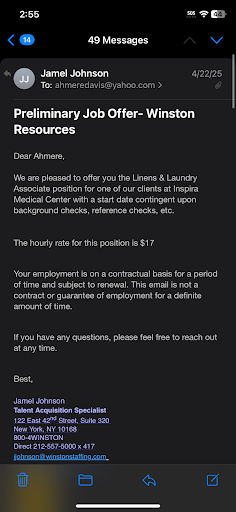 Read moreThis is my second review about this agency and the recruiter I was dealing with. I took down the first review after giving no stars to the recruiter Akber because I thought I would give him the benefit of the doubt. He reached out to me three months ago after applying to one of the agencies job postings and advertised the agency and how many connections they had to hospitals, big corporations, city jobs and etc. Akber got my hopes up in expressing how much help and assistance he can be during my job search and in the three months of looking for work he set up one interview. But only after I put up the first review about a month ago that is when he reached out to me finally set up an interview at Weill Cornell hospital. After sending numerous of emails with no responses and phone calls I am back to square one. Haven’t heard anything from akber after that interview, I sent two emails in the last two days and still no response. This agency and their recruiters are very unprofessional, I can’t speak for all of them but by reading the reviews of others I should have definitely stood clear of them. I have been dealing with another agency called Larkin Agency, a small agency with only about 5 staff members. In the three weeks of dealing with that agency Nancy has set me up on three interviews and scheduling another one this week. For all those seeking employment I would recommend Larkin over Winston. Winston sells dreams and gets your hopes up but doesn’t follow through. I would give no stars but they get one star for one interview in the three months of...