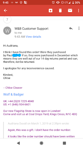 Read morei ordered a dress for $1,350.00 online January 10, 2019. Online confirmation said the order would be delivered anywhere from January 22- 24, 2019. Delivery dates came and went, no word from Wolf & Badger. Contacted them by email on February 13th, got a reply from Wolf and Badger that they had no idea what was going on, and had to contact the designer (do they have no controls over ensuring orders are fulfilled by their shippers ? Apparently not). Got back to me (Wednesday) to say they apologize and the designer would ship by Friday. I replied on thursday requesting a change to the order , and then they replied on Friday said no, the designer already shipped the order. No confirmation, no tracking number, nothing. Pretty basic stuff for an online retailer and very unprofessional in my opinion. Let’s see how this turns out, if I ever get this dress, that I ordered for a wedding end of April. Shame on me to have ordered from Wolf & Badger in the...