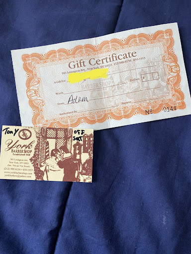 Ā Ā Ā Read moreI wanted to use a gift certificate from York Barber Shop, with a business card attached to it. I thought it was odd that there was no value or expiration date included, but I called and provided them with the certificate number and a picture. They rudely refused to accept it and blamed me for their staff selling a blank certificate. As a matter of good business they should have at least offered a haircut. It would have been a small gesture that would have gone a long way. Instead they were rude and refused to accept any responsibility. So much for trying to support...