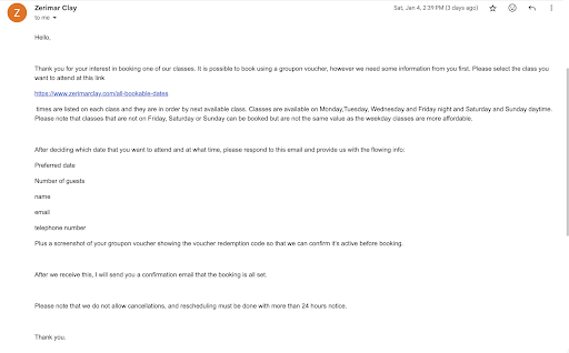 So, I go to a bar near by to try again to find the schedule page on the website. I find a schedule with times, and see a class on the same day. This is great. I figured I hangout in the bar with my lady, have a few drinks and head over when the time comes. I click around Zerimar's website to book a time that day, but the voucher number doesn't work. I try the Groupon code; that doesn't work either. I find an email on the website, so I email to ask how I can redeem my Groupon voucher. I'm given a list of instructions (attached the screenshot below) that I follow to the T, but I get no response back. I email again to reschedule, but still get no response. I call, but they don't pick up, so I leave a voicemail. At this point, I'm not sure if Zerimar is scamming me, or if I'm in an episode of Black Mirror. I do know one thing though; I would not recommend Zerimar if you are using Groupon; the process to redeem is horrendous, and at this point, I'm finding that my learning of pottery has turned into a lesson in patience. This was supposed to be a Christmas gift for my girlfriend, and I feel like all of this is unnecessarily stressful.