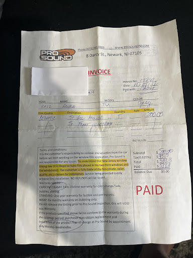 Overall, I highly recommend ProSound in Newark, NJ, to anyone looking for high-quality window tinting. They are professional, knowledgeable, and offer great prices. If you want to enhance the look and comfort of your vehicle, look no further than ProSound! They did an awesome job and I'm absolutely loving the look of my...