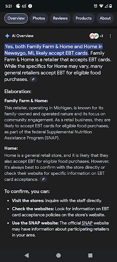 Me and my Mother walked in the store with tree price tag and asked the employee if they accepted food cards,EBT and he straight up said no we don't a so I then went on the government website and it says that newaygo Mi , FFH is indeed a participant of the EBT and he didn't think to check with a supervisor or a manager for confirmation, it was a food based product and the product was an apple tree witch was included in the EBT program anything and any plant that bears fruit or food, I am tired of seeing lacking employees who know absolutely nothing about there work place and what they are participating in it clearly states even on Google with a simple search that the newaygo FFH is in fact participating, please teach your employees better or have a sign that they can look off of for reference to what you guys participate with because the false advertisement...