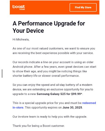 Read moreSadly, I think I will finally be making the switch from Boost to Verizon after 15 years, due to multiple instances of the employees being unable to help me in person at both the Newnan and Carrollton locations. The final straw was when trying to get the Boost deal emailed to me for a Samsung Galaxy S25 which is "only redeemable in store"; however the employee said that not only did they not have any in store, he couldn't even place an order for one for me to receive the deal. I kept getting told to "look online" even after explaining that I have already looked online and this deal only applies in store. This makes this deal completely unattainable since none of the local stores can follow through on their in-store-only offers and...