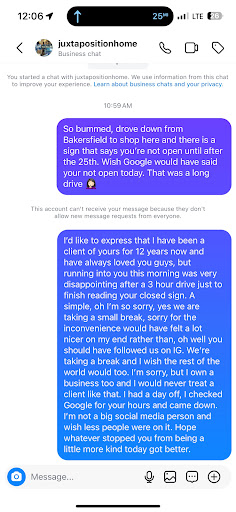 Read moreI’d like to express that I have been a client of yours for 12 years now and have always loved you guys, but running into you this morning was very disappointing after a 3 hour drive just to finish reading your closed sign. A simple, oh I’m so sorry, yes we are taking a small break, sorry for the inconvenience would have felt a lot nicer on my end rather than, oh well you should have followed us on IG. We’re taking a break and I wish the rest of the world would too. I’m sorry, but I own a business too and I would never treat a client like that. I had a day off, I checked Google for your hours and came down. I’m not a big social media person and wish less people were on it. Hope whatever stopped you from being a little more kind today got better. Google allows you to put your closed for a...