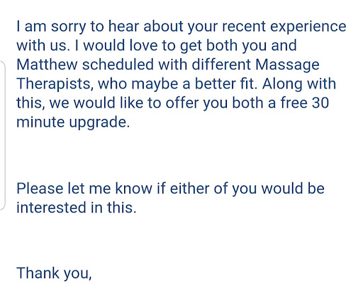 Read moreThis location is the worst of the franchise. We came in (two of us) for deep tissue massage and had the worst experience. To begin, my therapist had no idea he had a massage and was late to my appointment. He then began the massage with ice cold hands which was very unpleasant. Neither one of the therapist were able to provide deep pressure during our massage as we requested when booking our appointments. I asked about 4 times during the massage for more pressure. The therapist would do it for a minute and then go back to lightly caressing my back. Then after the disappointing massage, I emailed them right away, they did not get back to me. After submitting the ME survey online, they finally reached out. They offered to make new appointments for us with "a better fit" therapist "and along with this a free 30 minute upgrade". The best part is that the branch is expecting us (yes, the dissatisfied customer) to pay for a new session to give them a second chance. They are really out of their mind! I hope they come to their senses and refund us for the horrible massage we had at their location. Below is the email they send us, and then they expected us to pay. Be aware...