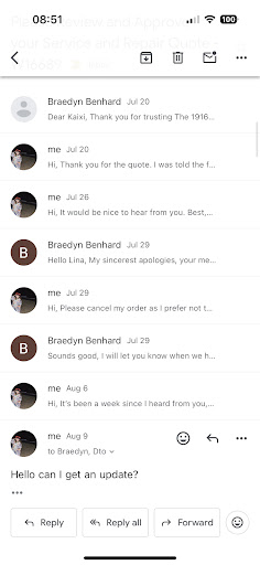 I didn’t receive the formal quote for 10 days and had to call the store twice to follow up. When I finally received it, the price was nothing like what I had been told, it ended up being 1k. You can see from my screenshot how responsive they are with their emails.