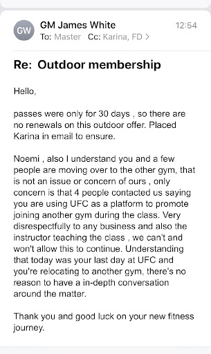 Read moreExcuse me? Promote? I am in no way affiliated with UFC or another gym. I had private conversations with a few friends, last time I checked that was not a crime. I can’t control eavesdroppers. I know some gym employees take the class and they were listening to my private conversations. I had a conversation with the instructor on Friday 08/07/20 when she told me about the new rate. I asked her how can you justify $49 for an outdoor spin class with limited equipment for which we have to show up extra early for to find a bike that works. Set up ez-ups that are damaged by the way when there are gyms that charge less per month for the entire gym and everything works? Stating facts is not promoting, I was not handing out flyers or collecting members information. I am entitled to my opinion. What happened to freedom of speech! Are you telling me today was my last...